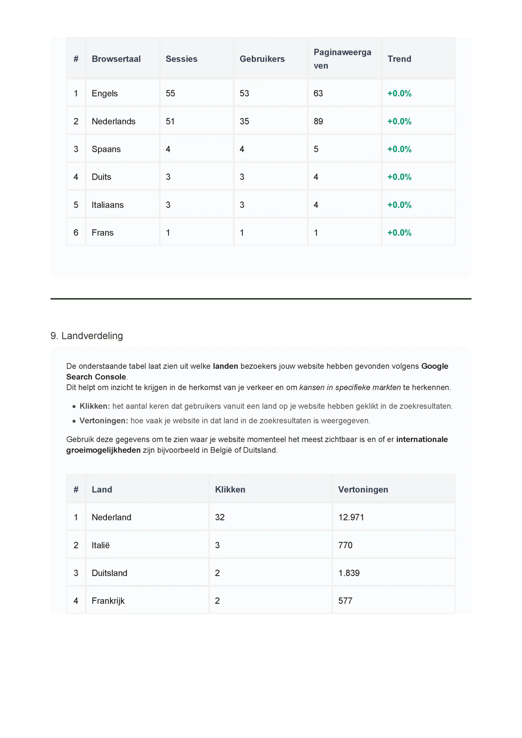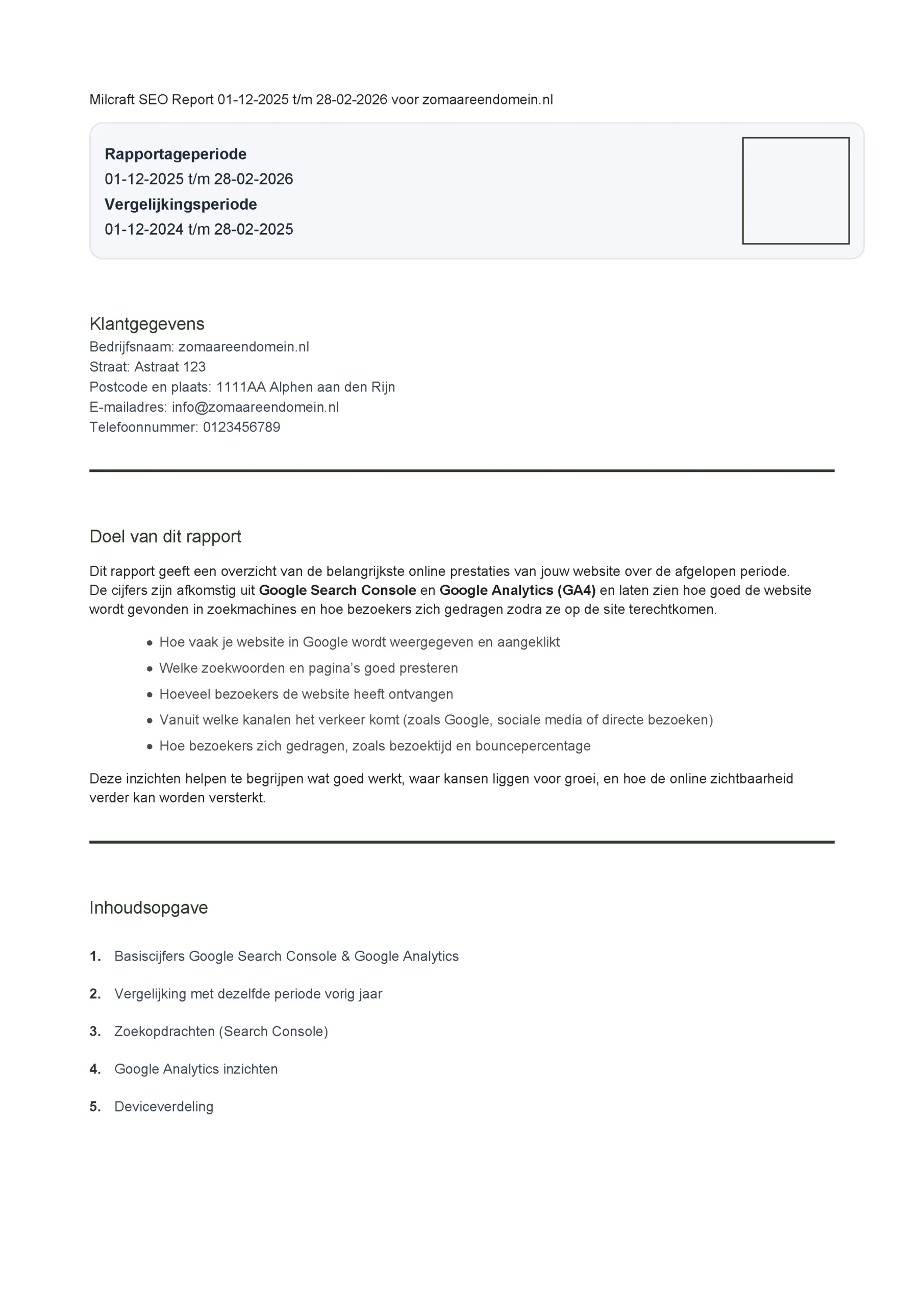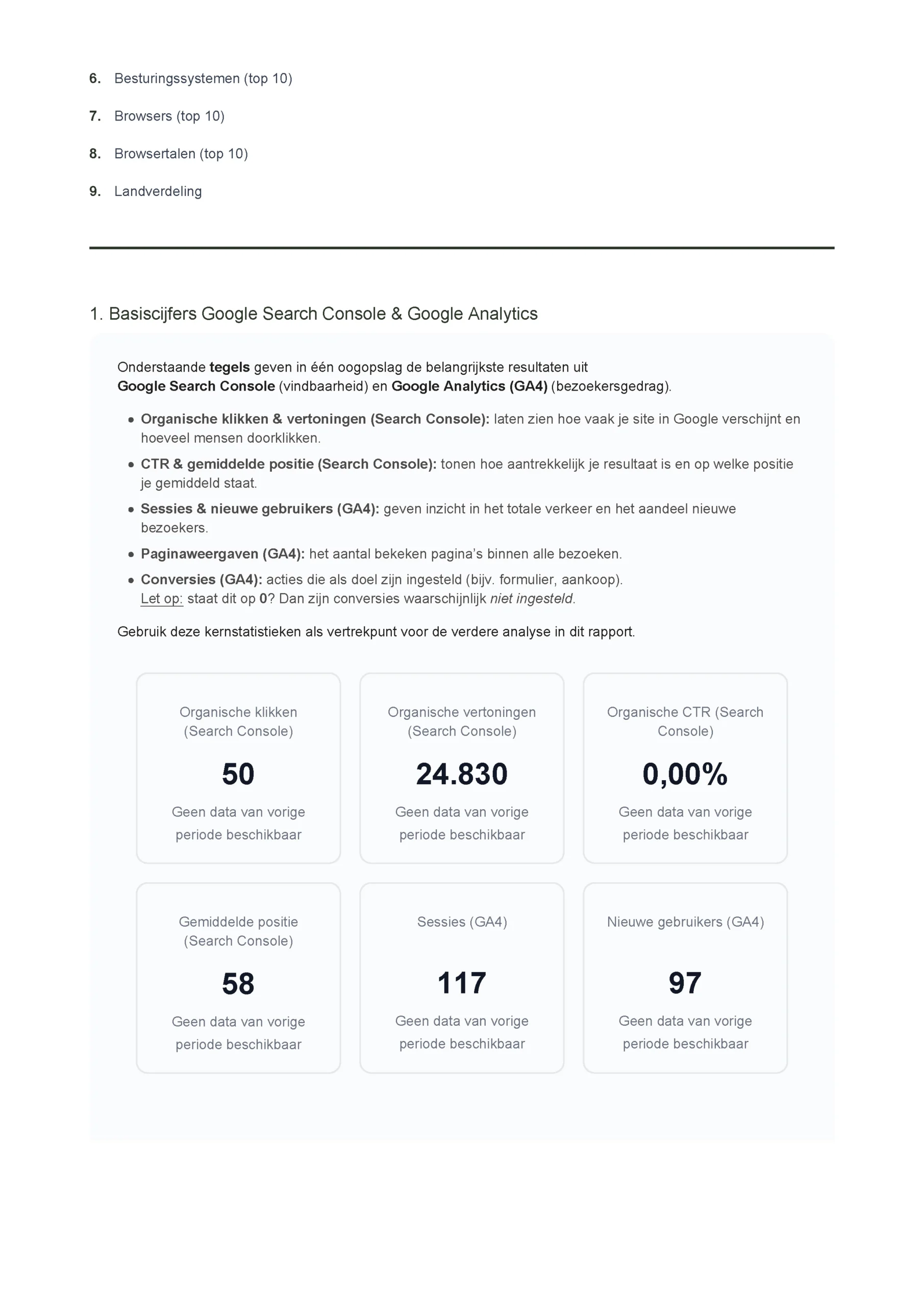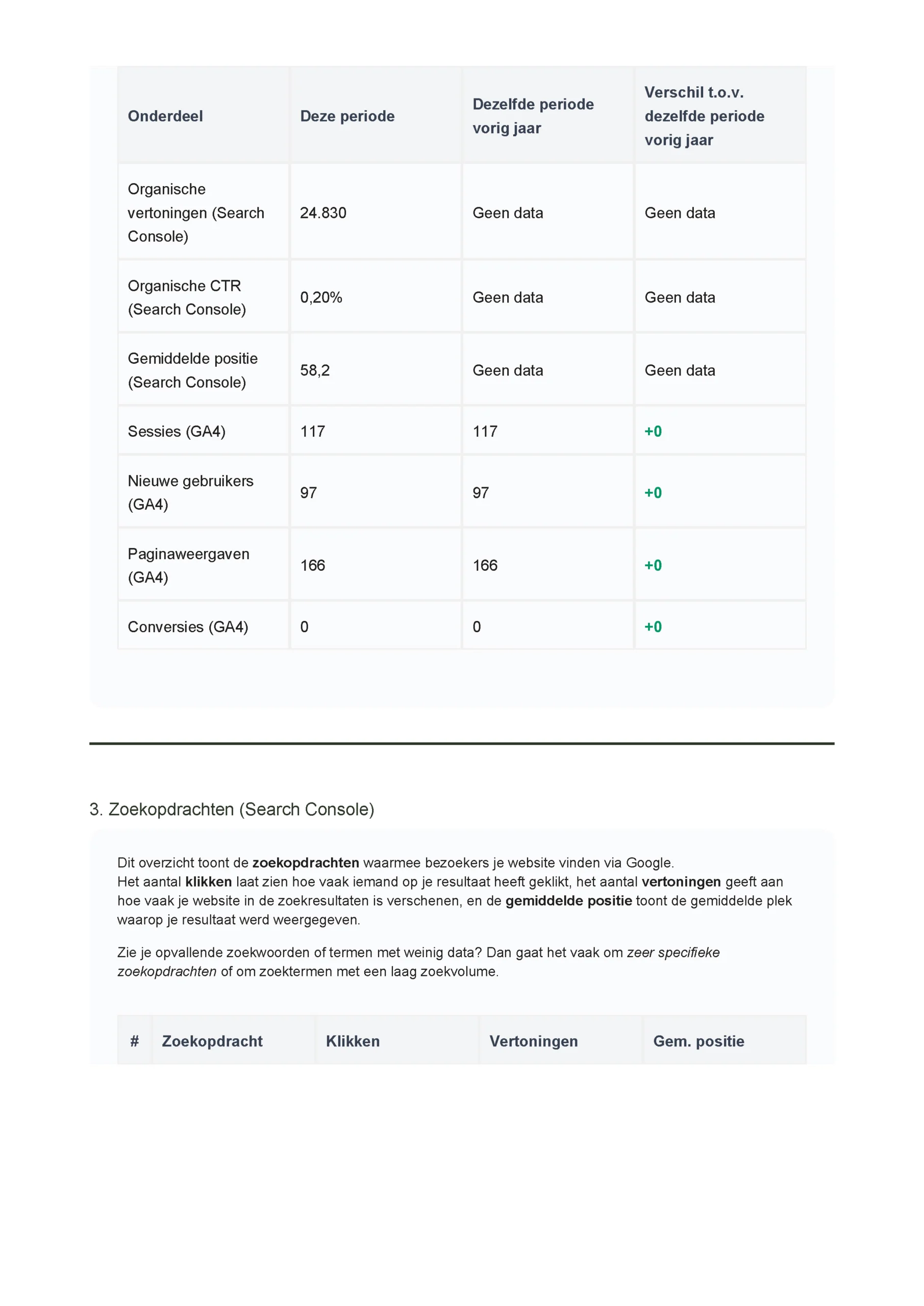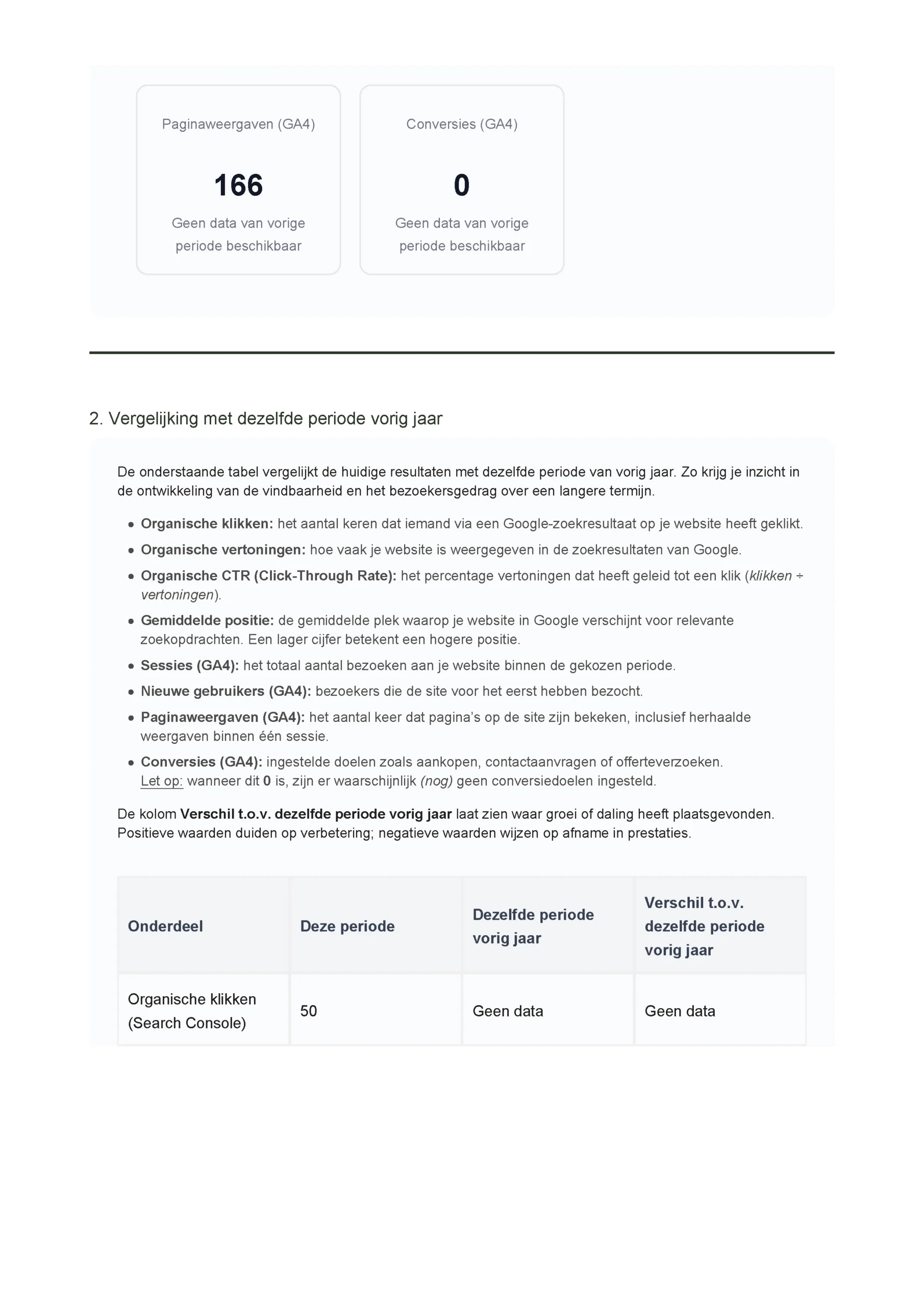 Dit rapport bestaat uit een pdf met data direct vanuit Google Analytics en Search Console.